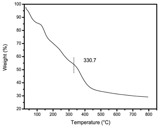 As shown in Figure 6, when CAG-GO20% was heated from 30 °C to 800 °C, the curve initially reduced relatively smoothly. This decrease was due to the gradual loss of water in the material. When the temperature increased to 330.7 °C, the rate of weight loss increased significantly. The main reason for this reduction was the decomposition of certain functional groups, such as hydroxyl and epoxy groups, in the high-temperature environment. As the temperature increased further, after 420 °C, the rate of weight loss decreases, and carbons in the carbon chains were gradually decomposed until a stable level was reached [26]. When the temperature reached 800 °C, the residual amount of the material was 29.16%.