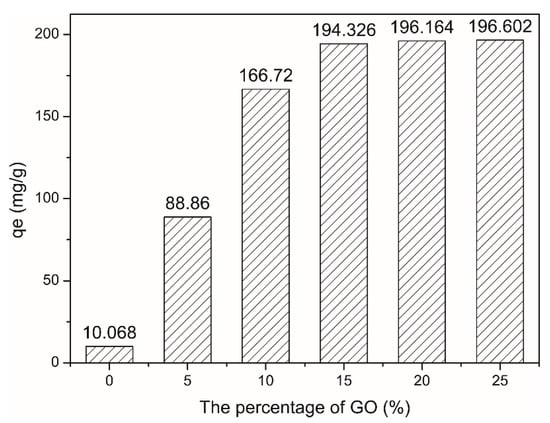 Figure 7 shows the effect of different GO proportions of CAG on the adsorption performance. The x-axis represents the percentage of GO in the total mass of the material, and the y-axis represents the adsorption capacity. When the GO proportion was 0 wt%, the adsorption capacity was only 10.068 mg/g, indicating a poor adsorption performance. As the GO proportion in CAG increased, the adsorption performance improved. When the GO proportion reached 15 wt%, the adsorption capacity was 194.326 mg/g, indicating that an increase in the GO proportion greatly increased the CAG adsorption performance. When the GO proportion exceeded 15 wt%, the adsorption capacity did not increase significantly. This is because the maximum adsorption capacity had already been reached. Therefore, the higher the GO proportion in the CAG, the better the adsorption performance. However, when the GO proportion reached 25 wt%, CAG generated a large amount of powder, which is not a desired feature for solution adsorption. Therefore, we used CAG with 20 wt% GO in subsequent experiments.