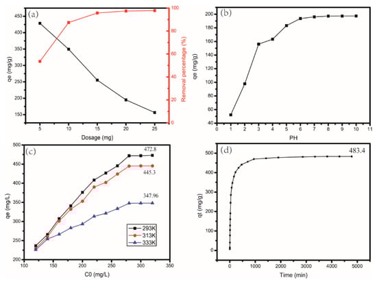 Effect of (a) dosage at room temperature (20 °C), MB solution: 20 mL, 200 mg/L, (b) pH 1–10, MB solution: 20 mL, 100 mg/L, room temperature (20 °C), (c) temperature, MB solution: 20 mL, 120–320 mg/L, (d) time, amount of CAG: 150 mg, MB solution: 300 mL, 300 mg/L, room temperature (20 °C) on adsorption.