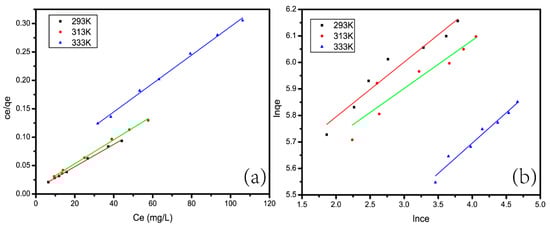 In the above formular, KL (L/mg) represents the Langmuir constant and qmax (mg/g) is the maximum adsorption capacity. Through comparison and calculation using the Langmuir model, we obtained the curve shown in Figure 9a. In Figure 9a, the x-axis represents Ce and the y-axis represents Ce/qe. We got the specific parameters by linear fitting the detailed values of qmax and KL. The results were listed in Table 2 As we can see, for the Langmuir model, the maximum theoretical adsorption capacities of CAG at 293 K, 313 K and 333 K were 510.2 mg/g, 476.19 mg/g, and 400.28 mg/g, respectively, which were similar to the experimental data. The correlation coefficients R2 were all greater than 0.99. It can be concluded that the experimental data fit the Langmuir model well.