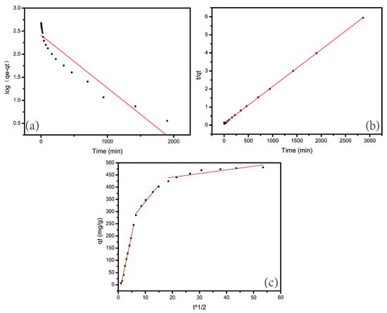 (a) Pseudo-first-order model, (b) pseudo-second-order model, (c) intraparticle diffusion model.