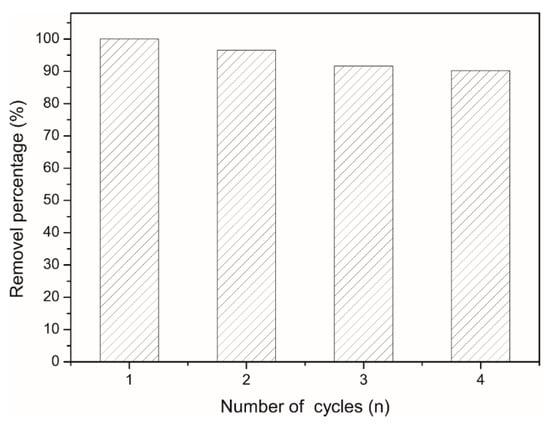In this experiment, we first added 10 mg of CAG to 20 mL, 100 mg/L MB solution. After constant shaking at room temperature (20 °C) for 48 h, we measured the concentration of the remaining MB solution. Second, we removed CAG from the MB solution and used the excess 3 M HCl solution for desorption. Specifically, we added CAG to the excess 3 M HCl first and let it desorb under constant shaking at room temperature (20 °C) for 5 h. Next, for removing the excess HCl and MB, we washed CAGs with distilled water several times. Then, we added the CAGs, that after washing and freeze-drying for 24 h, to 20 mL 100 mg/L MB solution again for 48 h with constant shaking at room temperature. The above experimental steps were repeated several times, and the experimental results are displayed in Figure 11, where the x-axis stands for the number of cycles and the y-axis stands for the removal percentage.