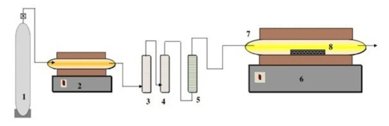 Schematic diagram for the experimental setup for vanadium carbide synthesize, 1—Argon gas cylinder; 2—Furnace containing copper turnings; 3—Pyrogallol; 4—Silica gel granules; 5—Flow meter; 6—Horizontal tube furnace (maximum temperature 1300 °C); 7—Fused alumina tube; 8—Fused alumina boat (sample holder).