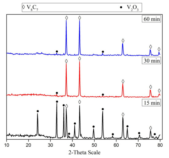 The effect of the reduction time of the V2O5-C mixture (milled for 15 h) was investigated at 1050 °C. Figure 4 presents the XRD patterns of phases formed during the carbidization process of the V2O5-C mixture at 1050 °C. It can be noticed that the carbide formation increases along with increasing the reduction time from 15 min up to 30 min. A further increase in reduction time had no significant effect on the formation of vanadium carbide, unless one increases the crystallite size from 80 nm at 15 min to 88 nm at 60 min.