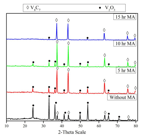 - Zhang, B.; Li, Z. Synthesis of vanadium carbide by mechanical alloying. J. Alloy. Compd. 2005, 392, 183–186. [Google Scholar] [CrossRef]