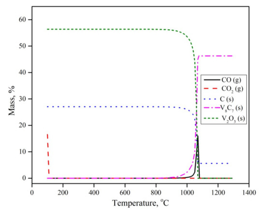The equilibrium calculations revealed that in the presence of carbon and argon as a carrier gas, V2O5 is not thermodynamically stable, and will dissociate into V2O3 and O2 in the ambient temperature and pressure. O2 then reacts with solid C and forms CO2, according to Equation (2)