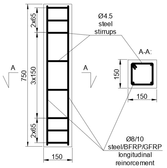 Tests and analyses concern axially loaded concrete elements with different reinforcement types. The sets of the specimens have been summarized in Table 1. There was one specimen of each designation used. The designation of the additional specimen is also included, for which only analytical and FEM analysis has been carried out (no experimental data were available—specimen B10 1). Dimensions of the elements are 150 mm × 150 mm × 750 mm. The reinforcement scheme is shown in Figure 1.