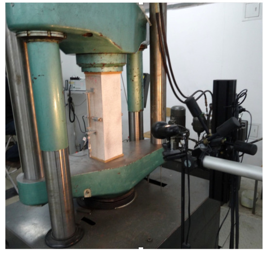 The stand (Figure 2) consisted of the press (EU 1000), Aramis appliance (for digital image correlation analysis) and strain gauge measurement system (for the measurement of stresses in bars). Concrete elements were positioned axially in the machine. At each end, pads were placed (made of wood chipboard plates) in order to reduce stresses caused by direct pressure of steel plates on the concrete element. Specimens were tested under a static mechanical load till failure and destructive force values for each type of reinforcement have been identified. Once the critical point of the load was reached, the mechanical load was sustained in order to obtain a full course of the static equilibrium path, also in the postcritical stadium. The damage form has also been analyzed.