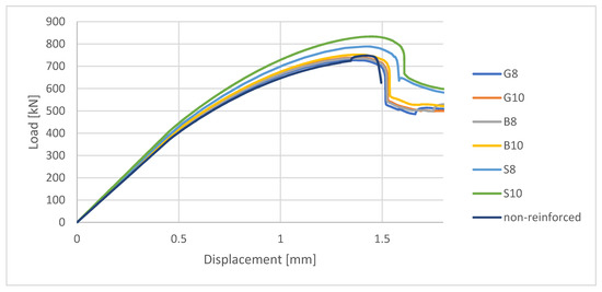 The load–displacement curve for FRP-reinforced specimens reveals some similarities to the non-reinforced specimen in terms of curve course as far as the maximum value of the load. In some cases, even the negative impact of FRP bars on the capacity of the element might be observed. The main difference, though, concerns the post-failure state. When concerning the non-reinforced element, the analysis is interrupted just after gaining the maximum value of the load, while FRP-reinforced (as well as steel-reinforced) elements could still be able to sustain a reduced value of the load.