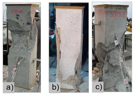 Concerning the G8 specimen (Figure 6a), the failure mode was sudden. A visible destruction started in the upper part of the specimen by detaching the concrete cover. While the maximum value of load was achieved, the crushing of concrete in the middle height part of the element occurred. In the B8 specimen (Figure 6b), initiation of failure was observed in the middle of the element. As soon as the maximum value of load was obtained, the concrete cover detached.