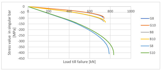 In Figure 7, the stress values in singular bars calculated in ABAQUS until the maximum value of the load are presented. It can be noticed that in the near failure stage dependence between stress in bar and load becomes non-linear. It can be a result of the plasticity and damage propagation processes occurring in concrete. The growth of stresses can be also observed and depends more on the type of the material (especially its modulus of elasticity) than on the diameter of the bar.