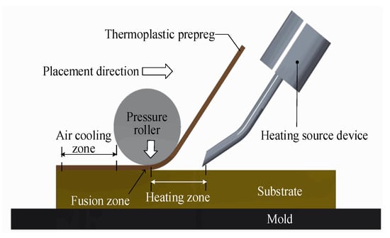 Thermoplastic fiber placement uses in situ curing technology, applying appropriate heat sources and pressure to the thermoplastic fibers to manufacture the component. The in situ curing technology adds curing heat sources during the preforming process. Thus, the heat source, which directly affects the placement effect and efficiency, is the key to the thermoplastic fiber placement process [15]. When the thermoplastic resin matrix reaches its melting point, the molecular chains move, which causes the resin matrix to change physically and to have a certain viscoelasticity. Due to the influence of external pressure, fusion of the thermoplastic fiber between the current layer and existing layers occurs [16,17]. The combination of thermoplastic composite materials and in situ curing technology significantly reduces the production cost and improves the production efficiency and the quality of composite material components. The temperature in the layer directly affects the fusion quality of the layer. When the thermoplastic resin matrix is exposed to high temperature, the change in its internal temperature is a nonlinear process. Boeing and Airbus have made research plans on thermoplastic composite materials for structural parts of aircraft, aiming to expand their application for the main load-bearing parts [18,19,20]. The automatic placement process of thermoplastic fibers is shown in Figure 1. The thermoplastic fiber placement process is mainly divided into the heating zone, fusion zone, and natural air-cooling zone. The purpose of heating is to make the first layer of thermoplastic fiber and the substrate layer reach a molten state together, becoming completely fused under the pressure roller. During this process, the molecular chains penetrate each other, diffuse into each other, and finally form an integrated part. Then, the substrate layer enters the natural air-cooling zone to undergo cooling and consolidation.