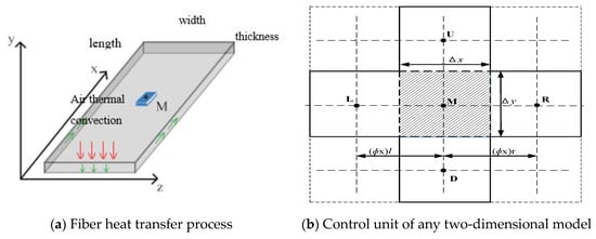 Figure 2b shows the control unit of any two-dimensional model in the thermoplastic fiber body. The heat is transferred from one unit to the adjacent unit in the upper, lower, left, and right directions. Point M in the figure represents the middle unit body. As indicated by the dotted line, point L represents the left unit of the middle unit body, point R represents the right unit of the middle unit body, point U represents the upper unit of the middle unit body, and point D represents the lower unit of the middle unit body. Equation (2) can, thus, be transformed into a discrete equation [38].