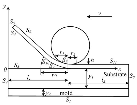 The change in temperature field in the thermoplastic fiber placement process is a transient process. The geometric model of thermoplastic fiber automatic placement is illustrated in Figure 3, as well as the corresponding boundaries, volume relationships, and coordinate positions. The coordinate system is located in the whole substrate and does not change with the placement forming process. The y-axis represents the thickness direction of the substrate vertically, with the origin set to the left side of the workpiece; the x-axis is set on the upper surface of the substrate, and the horizontal direction to the right is its positive direction. l1 is the distance from the nip point to the y-axis, l2 is the length of the melt region to the right boundary of the substrate, y1 is the thickness of the substrate, y2 is the thickness of the mold, r1 is the contact length along the x-axis between the roller and the fiber (the prepreg and the substrate are deformed during the action of the pressing roller, which causes the back of the pressing roller to contact the prepreg), r2 is the length along the x-axis between the back roller and the prepreg, r1 plus r2 is the total contact length of the pressing roller between the roller and the prepreg, wl is the heating length of the heating source, and h is the thickness of the prepreg. Si (i = 1, 2, …, 11) represents the boundary and position of each surface of the mold, the substrate, and the prepreg.
