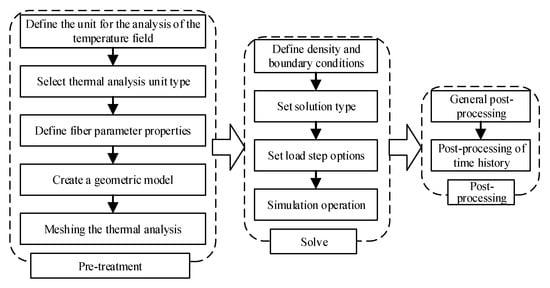 Thermoplastic fiber placement is a continuous process of gradual fusion between the prepreg and the substrate. Therefore, in the whole placement process, the temperature of the prepreg and the substrate at different positions changes continuously with time. In this paper, the finite element software Ansys was used to model and simulate the temperature field in the process of thermoplastic fiber placement. The specific steps of temperature field analysis during the placement process of thermoplastic fiber are shown in Figure 4.