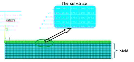 The meshing of the finite element model of the substrate and mold is illustrated in Figure 5. The thickness and length of the substrate were equally spaced, and two elements were meshed along the thickness direction of each layer. If the element size was smaller than that of the mold, the number of elements of the substrate was also greater and denser than that of the mold. Finally, the command flow was set by APDL, and the establishment of related models was completed.