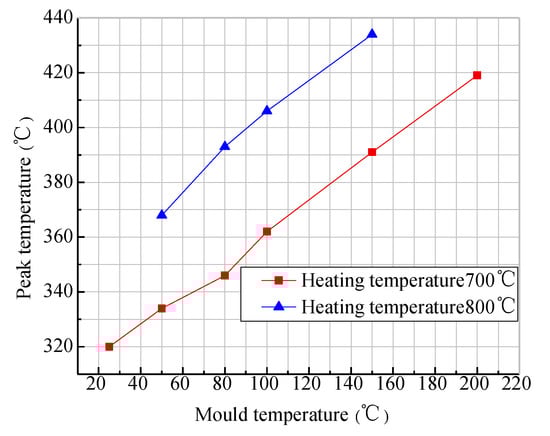 The node in the middle of the layer was selected to extract its peak temperature. Figure 6 shows the change curve of the peak temperature of the first layer under different mold temperature conditions, where the placement speed was 10 mm/s, and the two heating temperature values were 700 °C and 800 °C. It can be seen from the figure that, when the heating temperature was 700 °C and the initial temperature of the mold reached 150 °C, the peak temperature of the first layer was only above 370 °C. If the heating temperature was increased to 800 °C, with an initial mold temperature of 80 °C, the peak temperature of the first layer could reach above 370 °C, and the thermoplastic prepreg could reach the temperature required by the placement process. It can also be seen from the analysis results that the initial temperature of the mold had a certain relationship with the heating temperature. When the heating temperature is too high, the single thermoplastic prepreg can cause pyrolysis (resin decomposition reaction) or even spontaneous combustion. Therefore, in the first-layer placement, the initial temperature of the mold should be appropriately increased and the heating temperature should be lowered to prevent the pyrolysis of the single thermoplastic prepreg, which is not conducive to the quality of the layer. Through the analysis of the peak temperature during the first-layer placement process, it was obtained that the initial temperature of the mold had a great influence on the temperature field. It was also mentioned in the literature [32,33] that the preheating temperature of the mold is ideally close to the glass transition temperature of the material at 143 °C, which is conducive to the crystallization of thermoplastic materials, whereas excessive high temperature is averse to the formation of the layers. The relationship between the initial temperature and the heating temperature of the mold is integrated. In this paper, simulation of the thermoplastic fiber placement process adopted heating the mold instead of preheating. For this process, the initial temperature of the mold was set to 150 °C without special instructions.