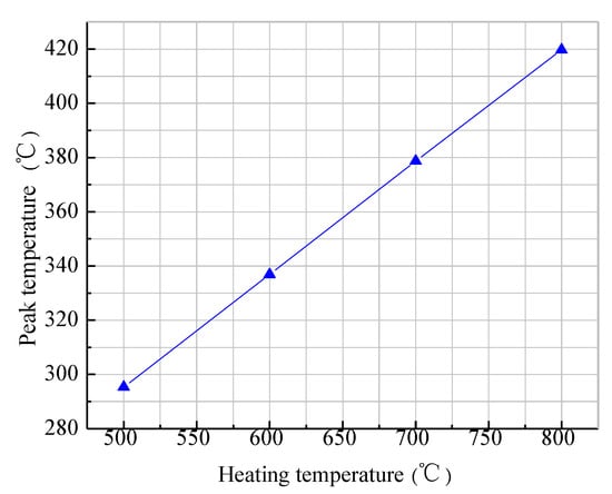 After the initial temperature of the mold was set, the influence of the heating temperature on the peak temperature was analyzed in the first layer. The change curve of the peak temperature of the first layer under different heating temperature conditions is shown in Figure 7, with a placement speed of 10 mm/s. It can be seen from the figure that, when the heating temperature was below 600 °C, the temperature of the substrate layer could not reach the required placement process temperature (above 370 °C), and, when the heating temperature exceeded 700 °C, the thermoplastic prepreg fiber could reach the normal placement process temperature and achieve interlaminar fusion. This also shows that the preheating of the mold can improve the initial temperature in the first-layer placement, but the mold still absorbs an amount of heat in the layer. Without a high enough heating temperature, it was difficult for the temperature to attain the process temperature. Therefore, when in the first-layer placement, the heating temperature was increased (ideally above 750 °C), such that it was conducive to interlaminar fusion in the first-layer placement process. At the same time, considering the relationship between the heating temperature and the placement speed, for the first-layer placement, the temperature in the layers could quickly reach the process temperature under low placement speed and high heating temperature. This was beneficial for interlaminar fusion under the action of the pressing roller, laying a certain theoretical foundation for the subsequent placement experiments.
