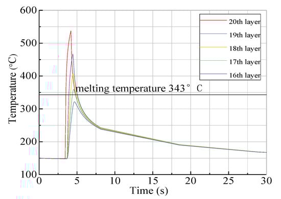 For thermoplastic fiber placement, the heating temperature is one of the key process parameters. The temperature gradient distribution of the substrate is mainly affected by the heating temperature. An appropriate heating temperature can improve the placement efficiency and obtain better fusion quality between layers. Temperature profiles of each layer are shown in Figure 8 with a placement speed of v = 20 mm/s and heating temperature of T = 700 °C, while the temperature fields of each layer are shown in Figure 9. The temperature curve of the 16th layer to 20th layer is illustrated in Figure 8, where the temperature change in any unit of the fiber body increased suddenly at the meshing point, reaching the maximum temperature value before gradually decreasing, with the peak temperature decreasing layer by layer. As seen in Figure 9, the temperature in the substrate obviously changed along the thickness and length directions, while it also showed a peak at the meshing point.