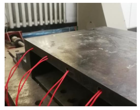 It could be derived from the simulation analysis that setting the initial temperature of the mold to 150 °C for the first-layer placement was beneficial for fusion quality improvement. On the one hand, the heat insulation effect on the substrate layer can be enhanced by an increase in layer number. On the other hand, the mold needs to keep the temperature of the bottom layer constant, which can always guarantee that the temperature of overall substrate layers is higher than the glass transition temperature. Considering the above reasons, a heating rod (pipe diameter: 10 mm) was utilized to heat the mold, maintaining the temperature at approximately 150 °C. Figure 12 shows a schematic diagram of mold heating. During the first-layer placement, the thermoplastic composite material could not be fused with the mold made of 45# steel. Therefore, a layer of high-temperature-resistant glue (resistance up to 1300 °C) was coated on the surface of the mold before placement, thereby ensuring that the first layer adhered to the mold, improving convenience for subsequent placement.