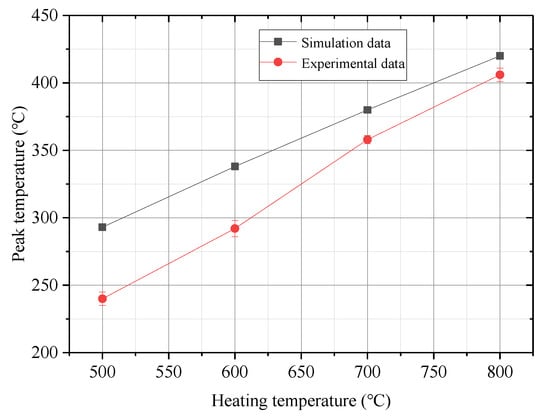 The number of experiments in each group was no less than five, and the average value was taken. The error range of the test results was ±6 °C. Figure 13 compares the peak temperature of the first layer under different heating temperatures with a placement speed of 10 mm/s and a mold temperature of 150 °C. It can be seen from the figure that the peak temperature increased as the heating temperature increased, but the measured peak temperature of the first layer in the experiment was lower than that obtained from simulation analysis. When the heating temperature reached 500 °C and 800 °C, the difference in peak temperature between the measured value and simulated value was approximately 54 °C and 16 °C, respectively.