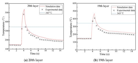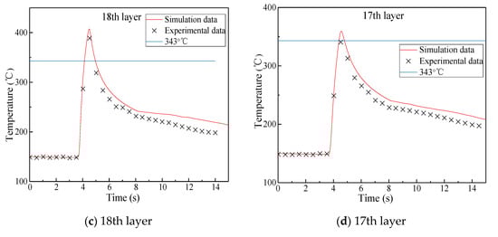 Figure 14 shows the temperature comparisons of the 20th, 19th, 18th, and 17th layers in the substrate layer of the laminate during heating between the experimental results and the simulation results with a placement speed of v = 20 mm/s and a heating temperature of T = 700 °C. It can be seen that the measured temperature field changes in the substrate of the layup were basically consistent with the results obtained from the simulation analysis, while the difference between maximum temperatures was relatively large. The reasons for this were as follows: firstly, due to the relatively simple settings of some regional boundary conditions of the simulation model, the results obtained from the simulation analysis were higher than those obtained experimentally; secondly, small local bubbles were formed at the thermocouples embedded in each layer during the measurement process, and the air thermal resistance had a great influence on heat transfer in the substrate layer, which resulted in the experimental results being lower than the true value; thirdly, although the mold temperature was maintained around 150 °C in the placement experiment, there existed heat conduction within the mold, the substrate, and the surrounding air, which resulted in the initial temperature of the top layer being lower than that of the bottom layer and the measured initial temperature being lower than the simulated value; lastly, during the placement of the thermoplastic fibers, the temperature field in the substrate layer changed transiently, and the temperature within layers fluctuated rapidly. The temperature change rate of the type K thermocouples had a delay in temperature measurement, while the acquisition time of the measurement system was set to a constant of 0.5 s. These factors may have resulted in the experimental values being lower than the simulation values.