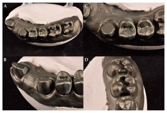 The present study used a maxillary complete-arch artificial dental model (A50H-Set; J. Morita Europe GmbH, Dietzenbach, Germany) fabricated with epoxy resin that was prepared for various inlays and complete coverage crowns. The artificial tooth model was scanned using a digital impression industrial precision scanner (stereoSCAN neo; AICON 3D Systems GmbH, Braunschweig, Germany). Scanned STL data were used, and the direct metal laser sintering technique was used to fabricate a maxillary right quadrant phantom model with cobalt-chromium (Co-Cr) material using a 3D printer (Eosint M270; EOS GmbH, Krailling, Germany). The types and locations of various inlays and complete coverage crowns prepared with the quadrant model were as follows: a complete coverage crown preparation on a maxillary central incisor, a mesio-occlusal inlay preparation on a maxillary second molar, a mesio-occlusal inlay preparation on a maxillary first molar (MxFM#16), an occlusal inlay preparation on a maxillary first premolar (MxFPM#14), and a complete coverage crown preparation on a maxillary canine (MxC#13) (Figure 1). Metal typodont is used to prevent from distortion or volume change due to the experimental conditions such as temperature and humidity. Heat application on metal typodont made its surface like it is sandblasted, resulting in no light distortion. So, there is no need to use powder on metal typodont [33]. During the experiment, the quadrant model was not altered by the addition or removal of teeth or the application of external force. All experimental actions were performed under experimental conditions, with a temperature of 23 ± 1 °C and a relative humidity of 50 ± 5%.