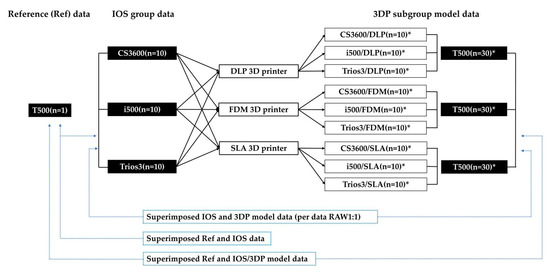 Three main groups (Ref-IOS, Ref-IOS/3D printed models (3DP), and IOS-3DP data) of the superimposed data read workflow diagram. (* Each printed model was scanned with a tabletop scanner to obtain standard tessellation language (STL) data).