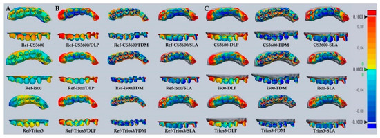 Representative deviations of superimposition using a surface matching software on the 3D digital model. Range of deviation was color coded from −100 (blue) to +100 µm (red). (A) superimposition between Ref-IOS data. (B) superimposition between Ref-IOS/3DP data. (C) superimposition between IOS-3DP data.