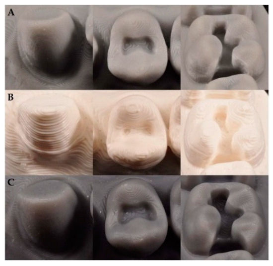 In the present study, a digital single-lens reflex camera was used to photograph teeth #13 (MxC/75°), #14 (MxFPM/90°), and #16 (MxFM/45°) at three different angles (75°, 90° and 45°) from three models that were 3D printed using three different methods (Figure 4). In the comparison of printed layer morphology by printer group, printing with a DLP 3D printer showed a somewhat jagged and thin smooth layer margin (Figure 4A). When printed with an FDM 3D printer, the margin did not appear prominently, and an insufficient thick layer appeared (Figure 4B). In contrast, when printed with an SLA 3D printer, layers with symmetrical straight smooth margins appeared (Figure 4C).
