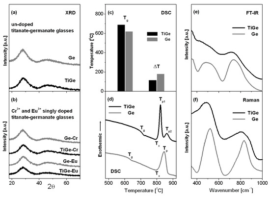 Titanate-germanate glasses were successfully synthesized and their structure and properties were examined using XRD, DSC, FT-IR, and Raman spectroscopy. Figure 1 shows XRD patterns (a, b), DSC curves (c, d), FT-IR (e), and Raman (f) spectra for titanate-germanate glasses referred as TiGe. They are compared to the results obtained for glass samples without titanium dioxide (Ge).