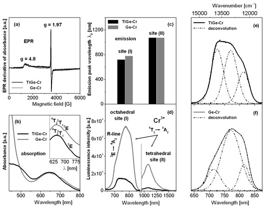 EPR (a), absorption (b), and luminescence (c,d) spectra measured for titanate-germanate glasses doped with chromium ions (TiGe-Cr) and compared to glass samples without TiO2 (Ge-Cr). Deconvoluted emission bands for both glass samples TiGe-Cr (e) and Ge-Cr (f) are also given.