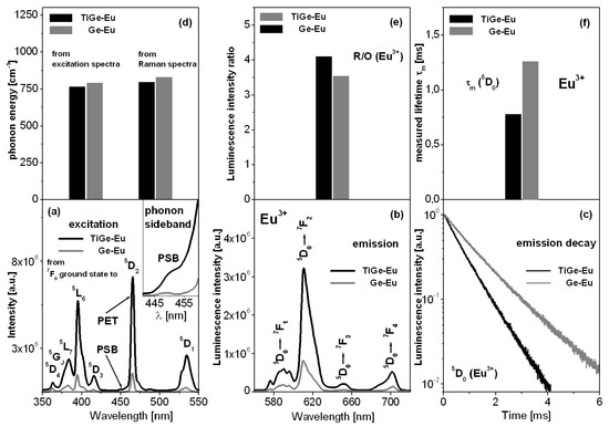 Excitation (Figure 3a) and emission (Figure 3b) spectra, and decay curves (Figure 3c) measured for titanate-germanate glasses doped with europium ions (TiGe-Eu) are presented in Figure 3. The results are compared to glass samples without TiO2 (Ge-Eu). All changes are also schematized on Figure 3d–f.