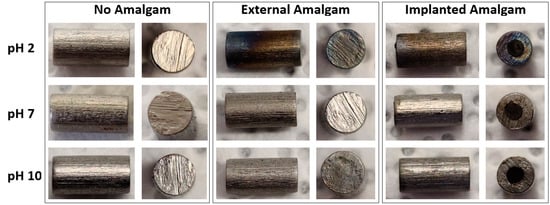 Ti rods (1/4” Diameter × 1/2” Length) purchased from Kurt J. Lesker (Jefferson Hills, PA, USA) of 99.995% purity were used for the experiment. The amalgam was purchased from Tytin (regular set, high Cu) (Brea, CA, USA). The self-activating capsules containing 59% Ag, 28% Sn, and 13% Cu were mixed with mercury according to manufacturer’s instruction to yield final weight percentages of 42.5% Hg, 33.9% Ag, 16.1% Sn, and 7.5% Cu. The experiment used 3 experimental groups: Ti rods without amalgam, Ti rods with implanted amalgam, and Ti rods with external amalgam that was not in direct contact with the rod (see Figure 1 for images). The various pH solutions were commercially purchased from Fisher Scientific (Waltham, MA, USA). The rods were individually submerged in 15 mL of each pH buffer in new polypropylene centrifuge tubes and maintained at 37 °C in a shaken water bath for a total of 4 weeks. After 2 weeks, the rods were removed, rinsed with deionized water, and allowed to dry overnight in a desiccator. Their mass was taken 3 times, and the result was averaged. The rods were then placed in a new buffer solution with new tubes for an additional 2 weeks. The samples underwent the same cleaning and mass measurements at the 4 week mark. The individual used buffer solutions at the 2 week mark were used in ICP-MS analyses. The raw count per second data may be found in the supplementary material supplementary material Tables S1–S5.