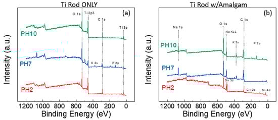 XPS survey spectra of (a) Ti rods submerged in various solutions without amalgam and (b) Ti rods submerged in various solutions with amalgam.