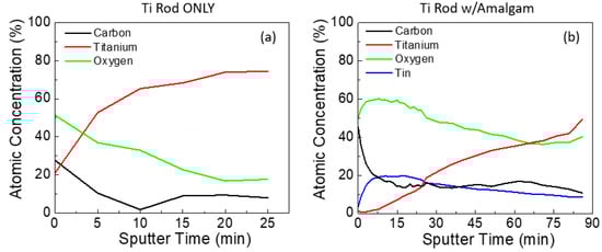 XPS depth profiles of the Ti rod immersed at pH 2 (a) without amalgam and (b) with amalgam.