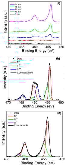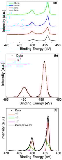 Peak deconvolution was performed on the Ti 2p, Sn 3d, and O 1s peaks for both Ti rods with and without amalgam placed in acidic solutions. Beginning with the Ti rods without amalgam, the stacked overlay of the Ti 2p peaks is presented at multiple sputtering times in Figure 4a. The analysis of the Ti 2p peak observed the spin orbit doublet peaks at ~454 eV (Ti0 2p1/2) and ~459.8 eV (Ti0 2p3/2) at the surface of the sample in Figure 4b (0 min), which is consistent with previous reports on TiO2 surfaces [42,43]. As the sputtering of the surface continued, the presence of the Ti2+ peaks became apparent at 455.3 eV (Ti2+ 2p3/2) and 460.8 (Ti2+ 2p1/2), as shouldering occurred in the primary metallic peaks [44]. A third peak was identified at ~461.8 eV, which has been observed in samples with intermixed and poorly defined Ti2+ and Ti3+; this third peak is likely a non-stoichiometric titanium oxide, and this has been labelled as Tix+ [45].
