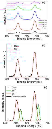 While the Ti presented a depth-dependent phase evolution, the Sn also presented significant changes with depth (Figure 6a). At the surface (Figure 6b), the Sn 3d exhibited spin-orbit doublet peaks at 486.1 eV(Sn4+ 3d5/2) and 494.6 eV (Sn4+ 3d3/2), with a peak separation of 8.5 eV [45,46,47]. As the sputtering progressed, the mixed tin-titanium oxide layer was revealed and the presence of Sn2+ became strongly apparent (Figure 6c), with spin doublet peaks at 492.8 eV (Sn2+ 3d3/2) and 484.4 eV (Sn2+ 3d5/2) and a peak separation of 8.4 eV.