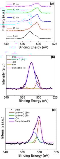 In Figure 8, the O1s spectra for the sample with amalgam again presented with several unique characteristics as compared to the sample without amalgam. The first characteristic in Figure 8a is that the surface appears to be heavily terminated with -OH groups, with only a weak presence of lattice site oxygen associated with Sn at 530.1 eV [45,46]. There was no observed peak for the lattice site oxygen associated with Ti. There was slight shouldering due to the presence of H2O at 534.3 eV [48]. The H2O may be adsorbed to the surface or incorporated into a rapidly grown mixed oxide film. As the depth profiling continued, the shouldering associated with H2O was not noted (Figure 8a). As the profiling continued, the peak for the lattice oxygen (Ti) presence became evident at 530.7 eV (Figure 8c) [42,43,48]. The minor shouldering for water was not observed with the sputtering, likely indicating that the water observed at the surface is adsorbed rather than incorporated into the film, as water’s continued presence would indicate the incorporation into the film.