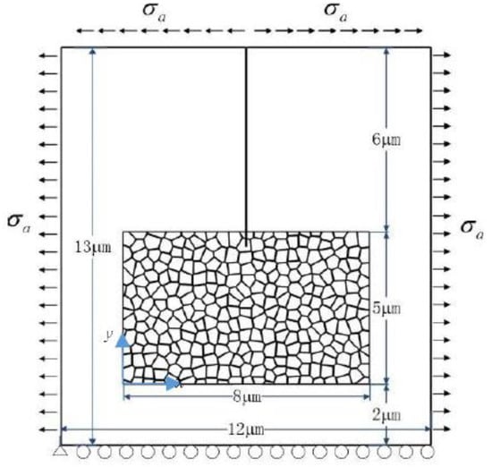 A 2D polycrystal model with an edge crack is built up to investigate the fracture behavior of TZP, as shown in Figure 1. The geometry of the polycrystal is firstly generated with the voronoi method. After that, some modification has been made manually so that the GBs possess finite width. The polycrystal model occupies a rectangle domain () and is embedded in an untransformable matrix (). The initial crack length is . The average grain size of the polycrystal model is 350 nm. The crystal orientations of the grains are randomly selected and fall in the range: . The GBs possess a finite width of 5 nm. This value is selected to balance the physical reality and the computation cost. The loading and displacement boundary conditions are illustrated in Figure 1. In the numerical simulation, the zero flux conditions are enforced on the boundaries:
