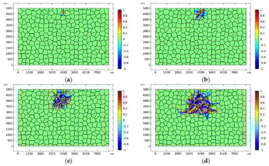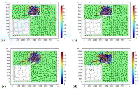 Figure 2 shows the evolution of the phase transformation around the edge crack where the applied load is and the simulation temperature is T = 1360 K. Figure 2 shows that the phase transformation initiates from the tip of the crack, which is a distinct manifestation of stress-induced phase transformation in the high-stress concentration area. The phase transformation propagates into the adjacent grains and reaches the equilibrium state (Figure 2d). It can be found that there exists a phase transformation zone around the crack tip. At the fringe of the transformation zone, monoclinic variants are present, which is the evidence of autocatalytic transformation in TZP. Overall, the transformation zone is equidimensional with some elongated finger-like monoclinic phases at the fringe of the phase transformation zone. It should be mentioned that this is the first mesoscale model that can successfully predict the shape and size of the transformation zone around the crack tip.