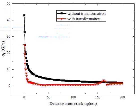 Distribution of the stress component in front of the crack tip for the cases where the phase transformation is considered or ignored.