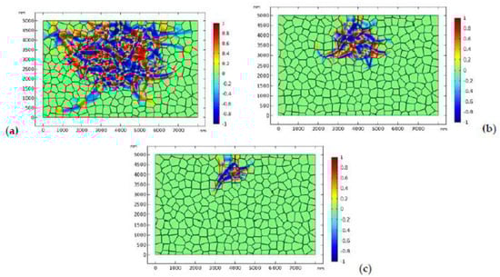 The equilibrium phase patterns around the crack tip under different loads are shown in Figure 5. In Figure 5a–c, the applied loads are , , and , respectively. The simulation temperature is 1360 K. As shown in Figure 5, it can be easily found that the size of the transformation zone is positively correlated to the applied load. Chen and Reyes Morel [15] proposed a formula based on the shear/dilatation criterion to predict the transformation zone. Yu and Shetty [4] provided a simplified formula to predict the characteristic length of the transformation zone. Both models suggest that the size of the transformation zone is proportional to the square of the applied stress intensity factor (SIF), i.e., , where is the applied SIF. Since , it can be deduced that . At the mesoscale, this relation may be not accurate to describe the relation between the size of the transformation zone and the external load. However, it still shows that the transformation size may increase dramatically with the external load. Compared to the size of the transformation zone shown in Figure 5, it can be found that the simulation results are in accordance with this conclusion.