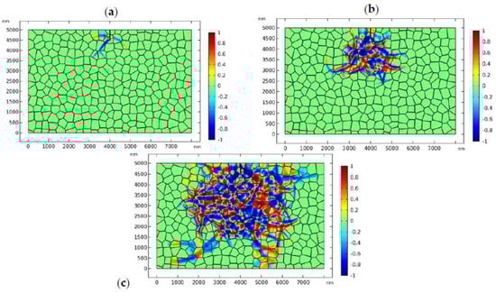 The converged crack tends to propagate intergranularly. Crack healing is also found during the evolution of the crack phase. The phase patterns evolve simultaneously along with crack propagation. Some of the monoclinic variants have degraded behind the crack tip due to the variation of the stress state. Comparing Figure 9 and Figure 10, we can find that, for TZP with “strong” GBs, the crack tends to propagates transgranularly while, for TZP with “weak” GBs, the crack is more likely to grow intergranularly. In the latter case, it is easier for the intergranular microcrack to nucleate in the GB zone. Intergranular microcracks have been observed in many experimental works [11,71,72,73]. In addition, for crack propagation in TZP with a “strong” GB, higher external load (180 MPa) is needed while, in TZP with a “weak” GB, 170 MPa is sufficient to drive the intergranular crack propagation. This implies that the toughness of the GB zone may have a close relation with the strength of the material.
