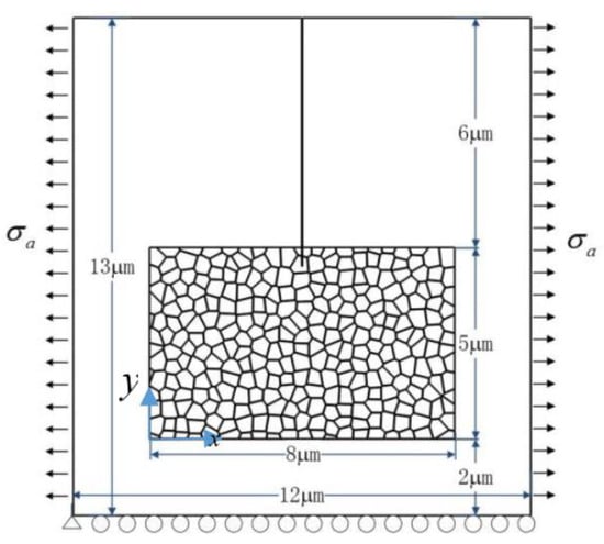 In TZP, crack propagation is accompanied with the tetragonal to monoclinic phase transformation. The phase transformation will produce a toughening effect on crack propagation. On the other hand, as the stress field is perturbed by the complex phase patterns, the crack may experience deflection [9,67] or branching [68,69,70] in the stress driven propagation process. Crack deflection and branching may also contribute to the toughening effect. In this section, crack propagation in TZP is studied with PF simulations. We assume that the intrinsic fracture toughness of TZP is uniform in all the grains and is assumed to be . Usually, the GB zone possesses lower fracture toughness. In the numerical studies, the fracture toughness of the GB zone is tuned to study its effect on crack propagation. A tensile load is applied at the side boundaries, as shown in Figure 6. The dimension of the numerical model and the crack length are illustrated in Figure 6. In the numerical studies, two different groups of crystal orientations are considered, which are denoted crystal orientation I and II in the following discussions, respectively.