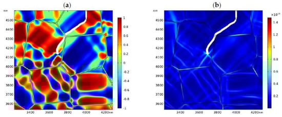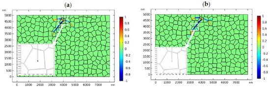 The critical load for crack propagation in linearly elastic material is determined by numerical simulations, which is around 98 MPa. When phase transformation is present, 98 MPa is insufficient to initiate the crack propagation due to the toughening effect of phase transformation (Figure 3). In Figure 7, the applied load increases to 110 MPa. The fracture toughness of the GB zone is assumed to be the same as that in the bulk material, i.e., . Figure 7 shows the evolution of the phase pattern and the crack phase. In Figure 7a, an initial perturbation of the crack phase is specified at the crack tip. The evolution of the crack phase is terminated for until the phase evolution around the crack tip has reached the equilibrium state (Figure 7a). After that, the crack phase and the phase transformation are allowed to evolve simultaneously. The simulation results are shown in Figure 7b. It should be noted that the PF model for fracture adopted in this paper allows crack healing. In Figure 7b, the phase pattern doesn’t change much compared with Figure 7a. However, the crack phase experiences degradation, which shows the toughening effect of the phase transformation.