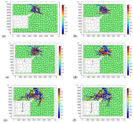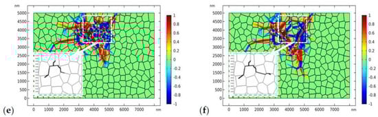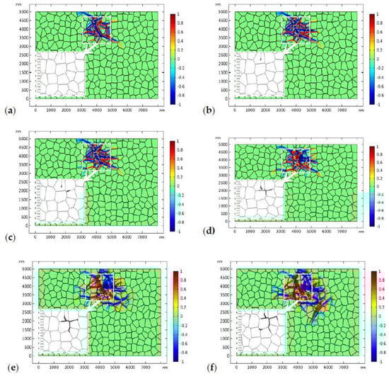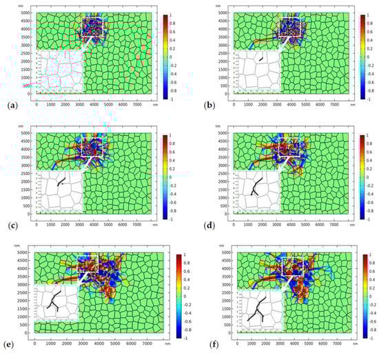Figure 14 shows the evolution of the phase pattern and the crack propagation when the GB zone possesses lower fracture toughness, i.e., . The applied stress is 150 MPa. Figure 14a shows the phase pattern before crack propagation. In Figure 14b,c, an intergranular microcrack starts to nucleate in the GB zone as the main crack propagates forward. The microcrack grows intergranularly and the main crack deflects from its initial path (Figure 14d). Then, the main crack converges with the microcrack (Figure 14e). In the crack propagation process, the phase transformation evolves simultaneously. As shown in Figure 14f, another microcrack starts to nucleate at the triple junction. The results presented in Figure 14 show that, for TZP with “weak” GBs, the main crack is more likely to propagate intergranularly as microcracks are easier to nucleate in the GB zone in such cases.
