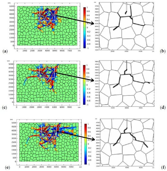 In the numerical studies, it is found that, besides the crystal orientation and fracture toughness of the GBs, the magnitude of the external load may also influence the crack propagation path. In Figure 17, the crack propagation paths in TZP with “weak” GBs under different loads, i.e., 160 MPa, 170 MPa, and 180 MPa, are exhibited. As shown in Figure 17, when the applied load is 160 MPa (Figure 17a,b), the crack mainly propagates intergranularly. The main crack experiences deflection. The propagation of the main crack is shielded by the intergranular microcrack before it can converge with the intergranular crack. As the fracture toughness of the GB () is much lower than that of the bulk grains, the crack nucleated in the GB zone tends to propagate intergranularly under external load. When the load increases to 170 MPa (Figure 17c,d) or 180 MPa (Figure 17e,f), the main crack can propagate forward and finally converges with the intergranular crack. After convergence, some monoclinic variants behind the crack degraded because of the redistribution of the stress field. Compared to the crack patterns where the load is 160 MPa and 170 MPa, the crack is more likely to propagate transgranularly when the load is 180 MPa. This implies that the external load may also influence the crack growing path. Under higher loads, the crack has the tendency to propagate transgranularly.