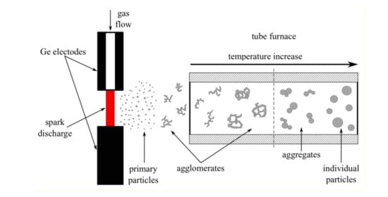 Germanium nanoparticles were produced using the aerosol spark discharge generator developed in our laboratory [20]. The system was supplemented by a tube furnace for nanoparticle sintering at different temperatures in gas flow (Figure 1) [22]. Electrode material is evaporated in the environs of the spark, initiated by gas breakdown under high-power current impulses. The erosion produces atomic clusters, which agglomerate and form primary nanoparticles with a size of 5 to 8 nm [19,20,21,22,23]. As the primary nanoparticles move further along the gas path, they collide and stick together, forming fractal-like agglomerates (Figure 2a). When the produced agglomerates move through the heated furnace with constant temperature along the entire length of the tube, partial or complete melting of the particles occur, depending on the furnace temperature, with a subsequent process of recrystallization into new-made particles.