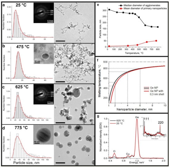It means, that the melting point of the particle is strictly defined by its size, significantly while the diameters of the particles are in the range of 1 to 10 nm (Figure 2f). At temperatures around 450 °C particles sized 2 nm in diameter start to melt and become an impulse for the larger particles melting. The presence of a liquid film diminishes the melting point for those larger particles at the rate of [26], where l is the thickness of the liquid shell. As can be observed from the histograms on Figure 2a,d, the fraction of the smaller particles goes down as temperature is increased. The minimal size of particles grows with an increase of temperature, since the smaller particles melt and become a shell for the larger ones. The presence of the liquid shell initiates melting of the larger particles at temperatures lower than calculated by Equation (1). As a result, all agglomerates produced at spark discharge transshape to monolithic spherical germanium particles during the sintering in the furnace at 775 °C, whereas a temperature near 800 °C is estimated to be the melting point for particles 6 nm in diameter. This size is close to the mean diameter of primary nanoparticles produced in spark discharge at room temperature (25 °C), without any additional heat treatment. Notably, the melting process of nanoparticle agglomerates takes place at temperatures much lower than the temperature calculated for an agglomerate of initial size (320 nm). The estimated melting point for 320 nm particles using the Equation (1) is equal to 936 °C and it is close to the melting temperature of bulk germanium. Thus, the melting of the agglomerates is strongly defined by the size of the primary nanoparticles, which formed the agglomerate, not the size of the whole agglomerate.